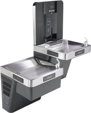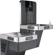 For added convenience, the front and side push-bar controls allow users to activate the drinking fountains using their elbow or forearm, releasing water at a smooth, laminar flow from the flexible safety bubbler. The bi-level configuration offers an ADA-compliant lower fountain, which can be installed on either the left or right side, ensuring accessibility for all users.